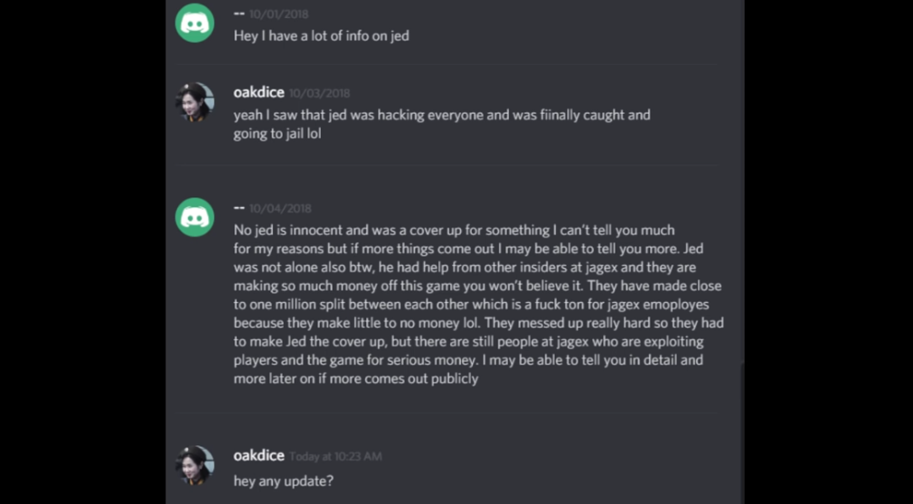 Verder maakte YouTuber OakDice bekend dat iemand vorig jaar contact met hem opnam. Diegene beweerde dat er een groep van Mods is binnen Jagex die al een miljoen achterover heeft gedrukt. Ze hebben Mod Jed gebruikt als zondebok en zijn nog steeds bezig met hun schimmige zaakjes. OakDice geloofde dit indertijd niet, maar is nu toch aan het twijfelen. Het is natuurlijk mogelijk dat Mod Jed zelf met OakDice contact opnam in een poging zijn naam te zuiveren.