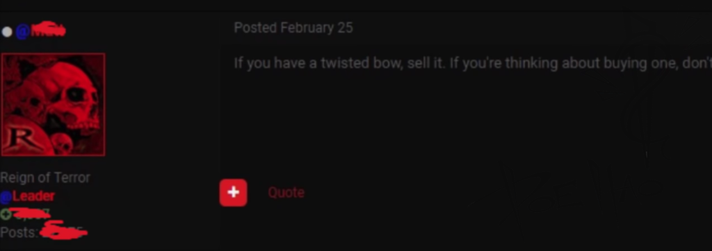 De Twisted Bow-glitch is een gewone glitch zou je zeggen. Vorig jaar op 12 juli was er een coin pouch-glitch, waarbij Scapers in één keer 2,147,483,647 coins konden genereren. De samenzweringstheorieën gingen pas echt los toen het bovenstaande bericht werd verspreid. Hierin zie je dat de beruchte clan (waar Mod Jed bij hoorde) Reign of Terror zijn leden drie dagen van tevoren waarschuwt om hun Twisted Bow te verkopen. Hoe kunnen ze dat weten, als het een oprechte fout is geweest? Het kan natuurlijk een handig staaltje Photoshop zijn om onrust te creëren, maar niet iedereen gelooft dat.